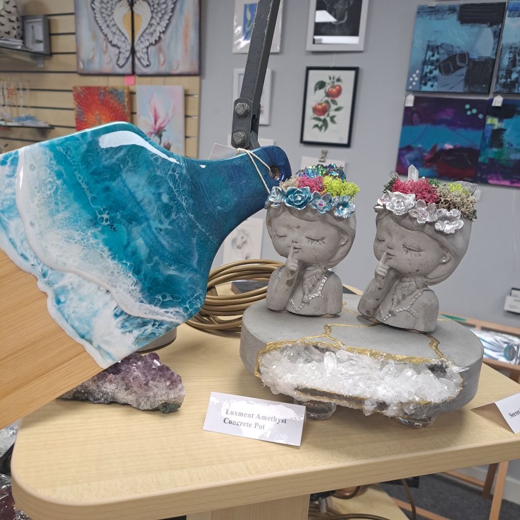 Whimsical decoupage, wood and resin creations. Cast concrete and sparkling crystals. Elegant and unusual.